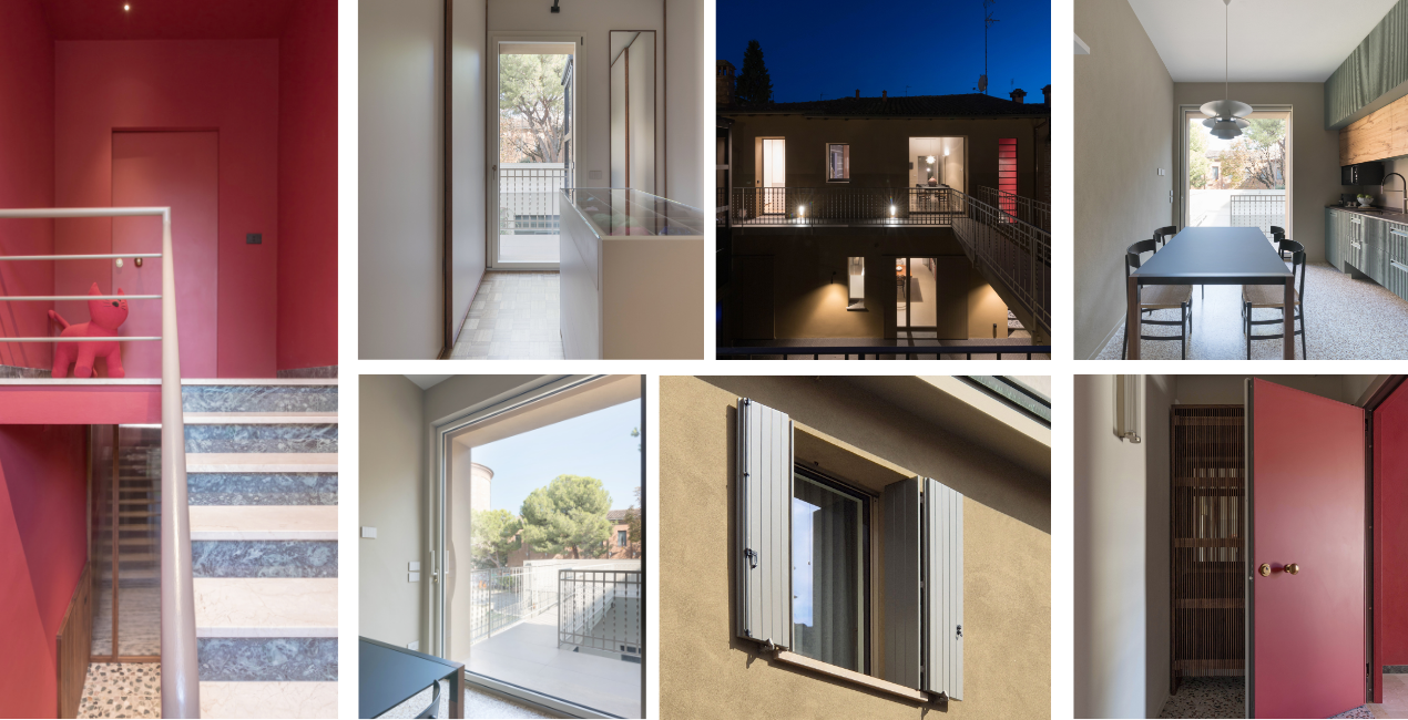 Il progetto privilegia linee pure e invisibili, con soluzioni su misura che rispettano l’impianto originale e garantiscono comfort contemporaneo. L’appartamento principale offre una connessione fluida tra interno ed esterno: la cucina si apre su una grande vetrata scorrevole verso il balcone, collegato a un terrazzo riqualificato tramite passerella sospesa. Pareti in intonachino di calce e steccato, sezioni in resine moderne, carte da parati eleganti o rivestimenti ceramici, con pavimenti originali restaurati e sostituiti solo nei bagni. Il colore diventa elemento strutturale, creando armonia, personalità e continuità tra gli spazi.